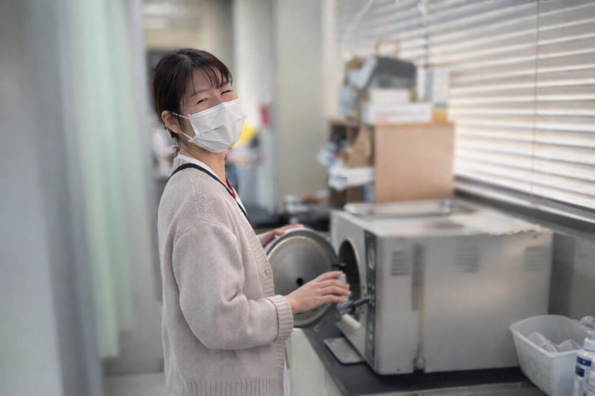 | 名前:野見山 美香さん 資格:准看護師 経歴:病院にて事務職を経験後、准看護師の資格を取得。病棟看護、クリニックを経験後、藤政病院へ入職。外来看護師として、診察介助や検査対応など幅広い業務を担当している。現在、勤務4年目。 |
